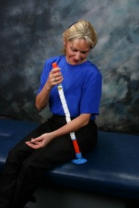 The tester holds the Intracell Stick by the spindles, not the handles. GENTLY roll up and down between the shoulder blade and spine on the side of limited motion. Use short back and forth strokes over these very tender muscles.
