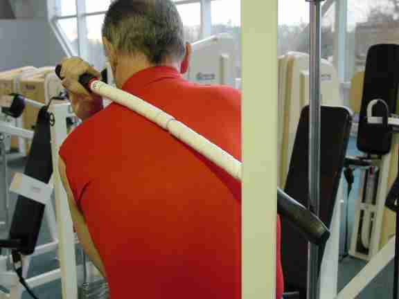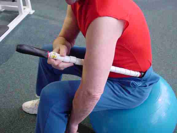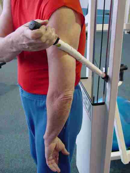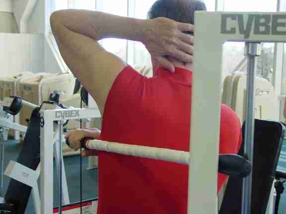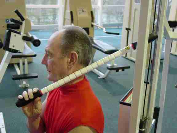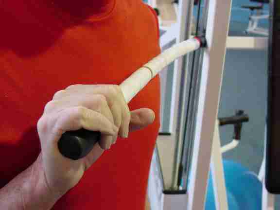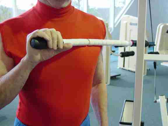 The accompanying pictures illustrate methods of anchoring The Stick for use on the upper body. Constant pressure against The Stick will insure a stable anchor. The more pressure used to bow The Stick – the deeper you’ll penetrate the muscle. In the pictures you’ll note that Cybex fitness training machines are used to anchor The Stick. This is accomplished by placing one end of The Stick between 2 closely paralleled parts of the various machines. The lower body is easy to access and requires no anchors.