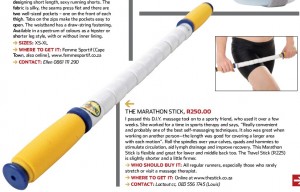 The review was written by Lisa De Speville, Runner’s World Gear Editor:The Marathon Stick – I passed this D.I.Y. massage tool on to a sporty friend, who used it over a few weeks. She worked for a time in sports therapy and says, “Really convenient and probably one of the best self-massaging techniques. It also was great when working on another person-the length was good for covering a larger area with each motion”. (Full RW Gear review article is here; PDF file) |